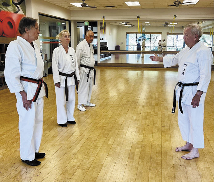 Left to right: Sensei John Evans, Linda Bleisch, and Larry Rowen with Sensei Herum instructing