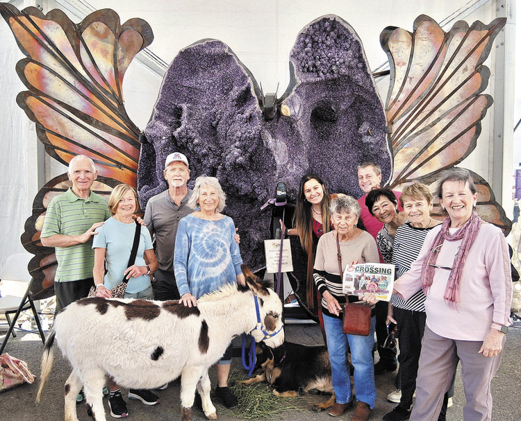 Members of the Let’s Travel Club on a special guided tour of the Tucson Gem & Mineral Show: John Twyman, Liz Lonney, John Turman, Carol Berg, Joan Railton, Shirley Jen, Pat Wilson, and Joyce Shumate. In the foreground are our tour guides Melina Mera and Jason Scott, owners of Sonoran Magic in Green Valley.