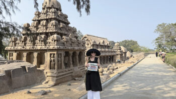 Liz Ashby at Five Rathas, a group of 7th century temples in Mamallapuram, India