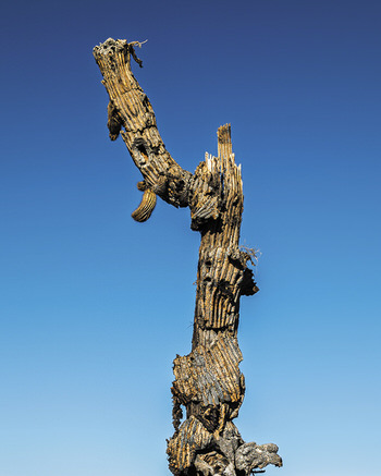 The photo of this Saguaro was taken on our Quail Creek golf course, Road Runner #3, near the tee box on Sept. 20, 2025. A significant thunderstorm with lightning occurred on Sept. 18, two days before. This poor cactus was hit by a bolt. I jumped out of the golf cart and shot it with my Google Pixel 9 smart phone— the only camera I had with me. The only post processing was to crop the shot, showing the “weathered cactus” a bit better. The uncropped shot shows cactus debris on the ground beneath the photo.