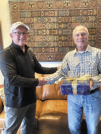 Frank Baker, QCPC president, presents a thank you gift to Dave Mungo, outgoing QCPC president.