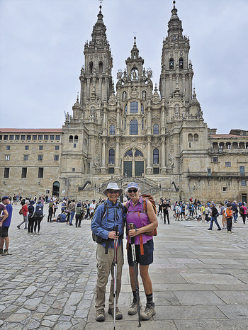 Alfred and Cindy Gong complete their 500-mile Camino in front of the Catedral de Santiago de Compostela in Northern Spain.